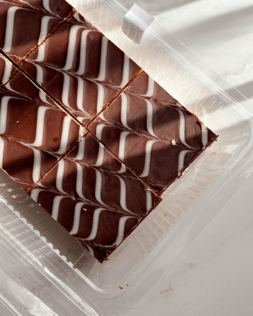 The slices are a generous size, the caramel is sweet but not sickly, the biscuit base is light (but doesn’t crumble like some gluten free bases do), and the milk and white marble chocolate top adds a nice little point of difference. Plus, the pattern makes it look a little more fancy than some of the others on the market!