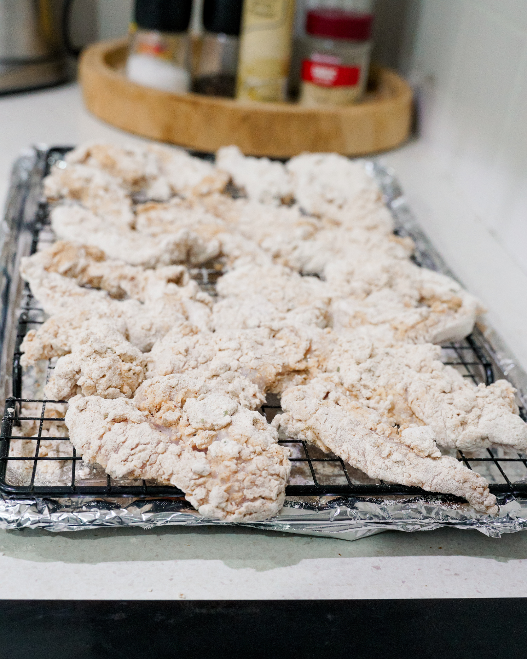 - Coat each piece of chicken in the dry mix, and leave to sit for half an hour in the fridge (we like to spread it out on a cooling rack, so that the air circulates around it).